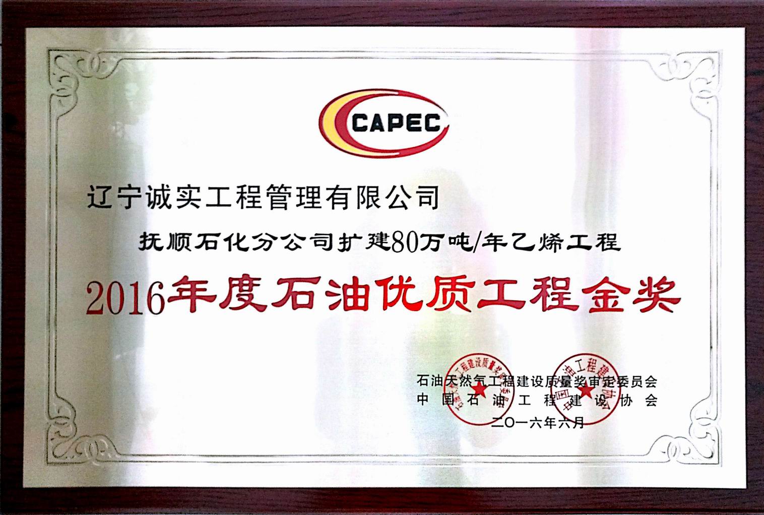 2016年石油優(yōu)質(zhì)工程金獎(jiǎng)(撫順石化分公司擴(kuò)建80萬噸/年乙烯工程)