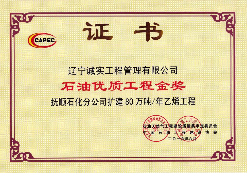 2016年石油優(yōu)質(zhì)工程金獎(撫順石化分公司擴(kuò)建80萬噸/年乙烯工程)