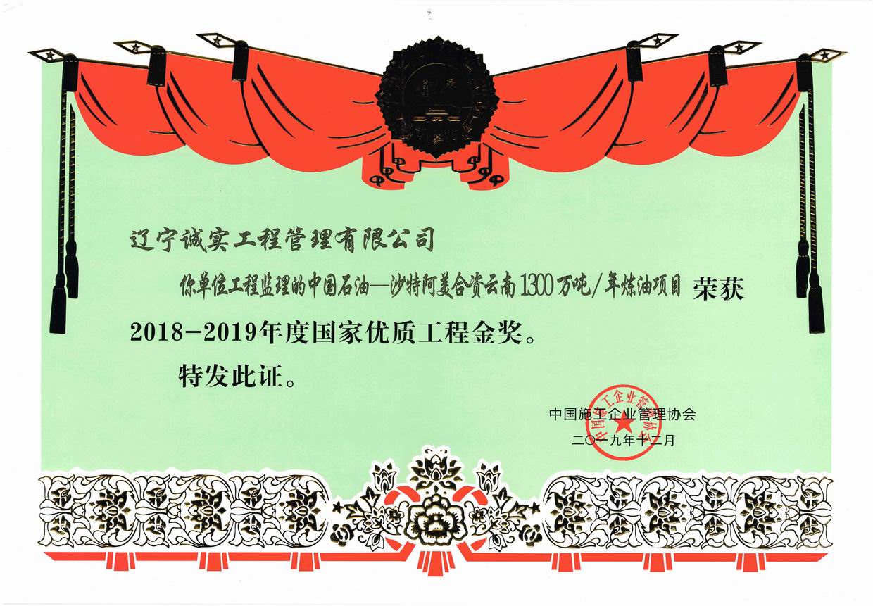 2018-2019年度國(guó)家優(yōu)質(zhì)工程金獎(jiǎng)(中國(guó)石油-沙特阿美合資云南1300萬(wàn)噸/年煉油項(xiàng)目)
